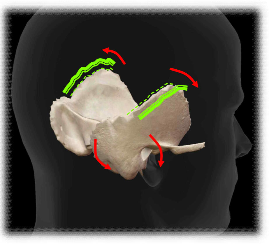 안면비대칭은 접형골과 후두골 그리고 측두골(턱관절)의 비틀림, 일측측굴, 일측회전 등으로 인해 발생합니다.