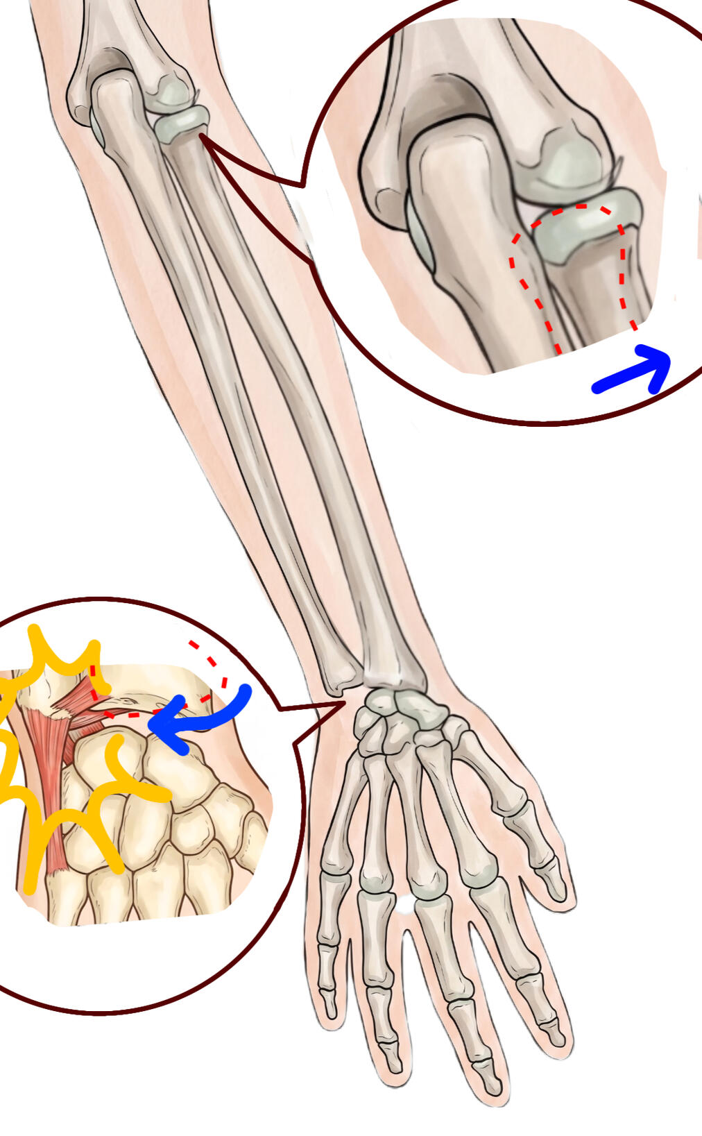 팔꿈치, 손목, 그리고 손가락에 주로 나타나는 질환들은 테니스엘보, 골프엘보, 손목터널증후군, 드퀘르벵, TFCC 손상 등 입니다.보통 원인을 외상이나 과사용, 그리고 이로 인한 해당 조직(인대, 힘줄, 힘줄집 등)의 염증, 파열, 손상 등으로 설명합니다. 하지만 정말 외상이나 단순 과사용만이 원인이라면 안쓰면 낫지만 보통 그렇지 않습니다. 안쓰면 조금 낫는 것 같다가도 조금만 쓰면 다시 아파옵니다. 또한 팔은 전혀 안쓸 수도 없으며 안쓰면 근위축이 오고 관절이 굳으니 안쓰는 것이 답이 되지 못합니다.이곳의 통증이 반복되는 더 근본적인 이유는 사용 시 손상 될 수 밖에 없는 뼈의 구조를 갖고 있기 때문입니다. 뼈의 정렬이 맞지 않아 문제의 조직(인대, 관절면, 힘줄 등)이 부하를 많이 받거나 물리적인 손상이 직접적으로 가해지기 때문입니다. 그리고 뼈의 구조가 이런 비정상적인 형태로 된 이유는 이런 부정렬을 야기하는 관련 뼈들의 관절범위가 제한이 있기 때문입니다.TFCC 손상 후 반복적인 손목 통증을 예를 들자면, 옆의 그림과 같이 아래팔 뼈 2개중 하나가 팔을 펼 때 팔꿈치 안으로 또는 밖으로 움직이며 회전하는 것이 아주 조금만 제한이 있더라도 손목을 이루는 부분에서의 회전 제한은 크게되며 이는 손목 부근의 다른 뼈들과의 관절면과 인대, 그리고 TFCC를 이루는 손목뼈들과 부정렬을 야기합니다. 이것은 이 부분에 힘이 가해지는 일이 발생될 때 TFCC를 이루는 뼈들의 부정렬을 야기한 곳에 부하가 많이 걸리게 되며 조직 손상 후 회복이 안되며 반복적인 손상으로 이어집니다.TFCC 손상에 대한 치료는 일례로 든 것이며 테니스/골프 엘보 드퀘르뱅 건초염을 비롯한 손목과 손가락의 건초염, 손목터널증후군도 위와 같은 원리로 근본적인 구조적 문제를 확인하여 치료합니다.