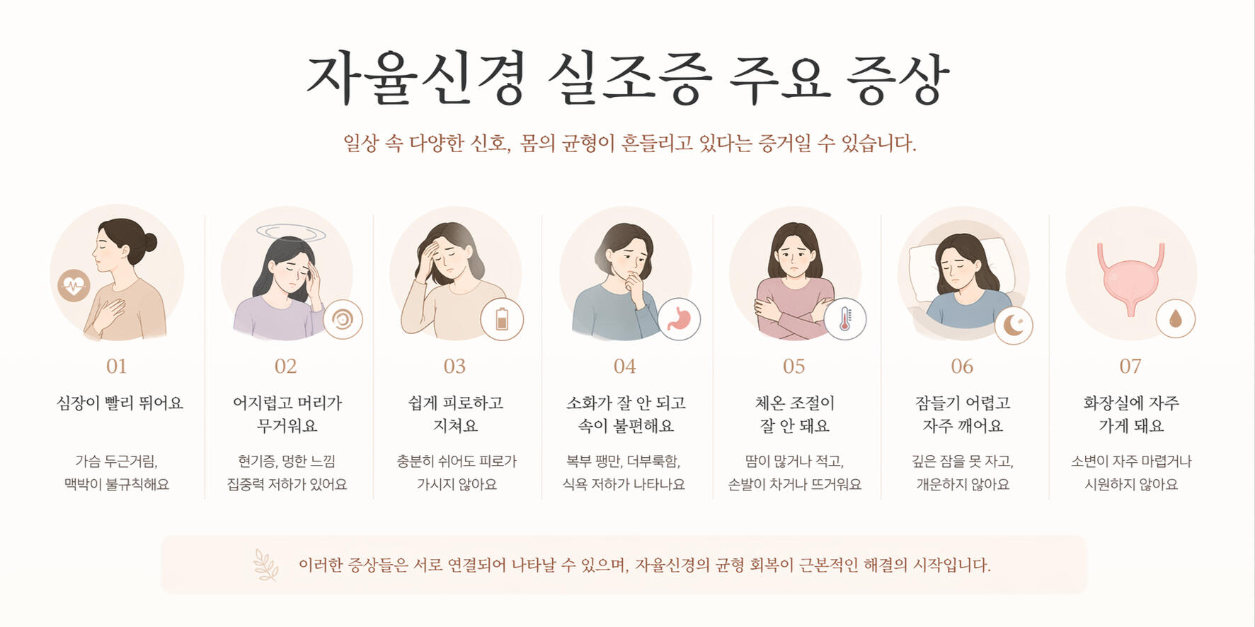 자율신경은 심장, 혈압, 호흡, 체온, 혈액순환, 소화, 수면을 조절하는 시스템입니다.